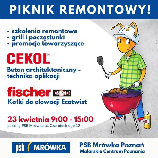 PSB Mrówka w Poznaniu na Wildzie. Mrówka to przede wszystkim duży sklep remontowy - Malarskie Centrum Poznania,, sklep z farbami oferujący wszystkie popularne marki farb do wnętrz i farby ogrodowe, impregnaty a także specjalistyczne farby do metalu, na rdzę i do drewna. Oferujemy sprawdzone marki farby Dulux, Beckers, Tikkurila, Magnat, a także Hammerite czy Altax oraz usługę mieszania farb na mieszalniku Tikkurila. Posiadamy również bogaty dział narzędziowy : elektronarzędzia i narzędzia ręczne, artkuły metalowe oraz duży dział BHP z odzieżą roboczą i akcesoriami BHP. Na wykonawców i instalatorów czeka również dział instalacje i hydraulika oraz elektryczny i oświetleniowy. W sklepie znajduje się również stoisko z surowym drewnem, akcesoria do mocowania, okucia, listwy.