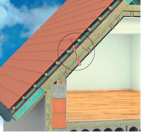 Pierwszą warstwę ocieplenia, np. z wielkowymiarowych płyt TOPROCK grubości 10-20cm układa się między drewnianymi elementami konstrukcji dachu. Z odcinków o długości do 6m docina się kawałki o 1,5-2 cm szersze od odległości w świetle między krokwiami. Taki naddatek i sprężystość skalnej wełny pozwalają na wykorzystanie sił tarcia i samodzielne utrzymywanie się tak dociętego ocieplenia między nimi.